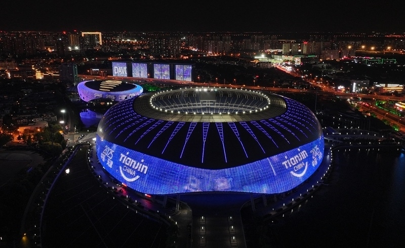天津奧體中心體育場點(diǎn)亮夏季達(dá)沃斯主題燈光(無人機(jī)照片,6月20日攝)。