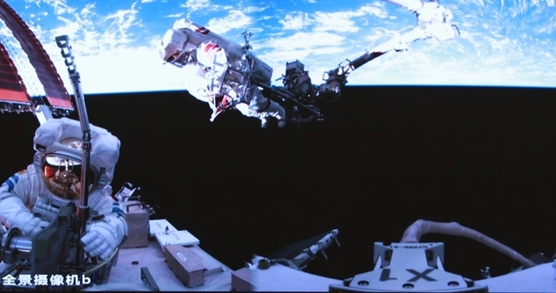 這是6月26日在北京航天飛行控制中心屏幕上拍攝的神舟二十號航天員陳冬(左)與陳中瑞在空間站組合體艙外工作的畫面。新華社發(fā)(周柯毅 攝)