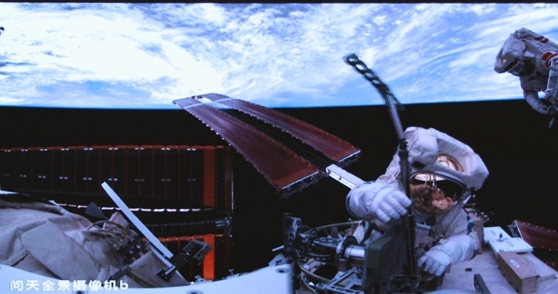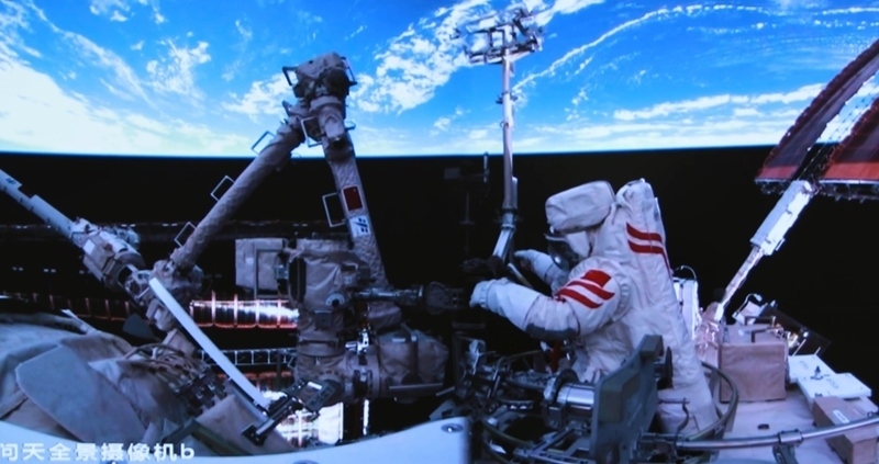 這是6月26日在北京航天飛行控制中心屏幕上拍攝的神舟二十號航天員陳中瑞在空間站組合體艙外工作的畫面。新華社發(fā)(周柯毅 攝)