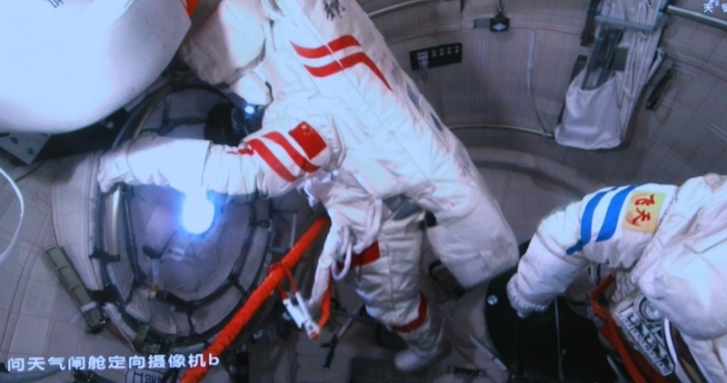 這是6月26日在北京航天飛行控制中心屏幕上拍攝的神舟二十號航天員陳冬(右)與陳中瑞在問天氣閘艙準備關(guān)閉艙門的畫面。新華社發(fā)(周柯毅 攝)