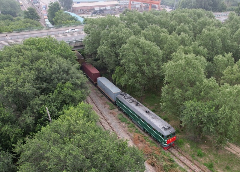 6月30日,北京至阿塞拜疆巴庫的跨里海中歐班列??吭谖挥诒本┦蟹可絽^(qū)的北京國際陸港等待發(fā)車(無人機照片)。
