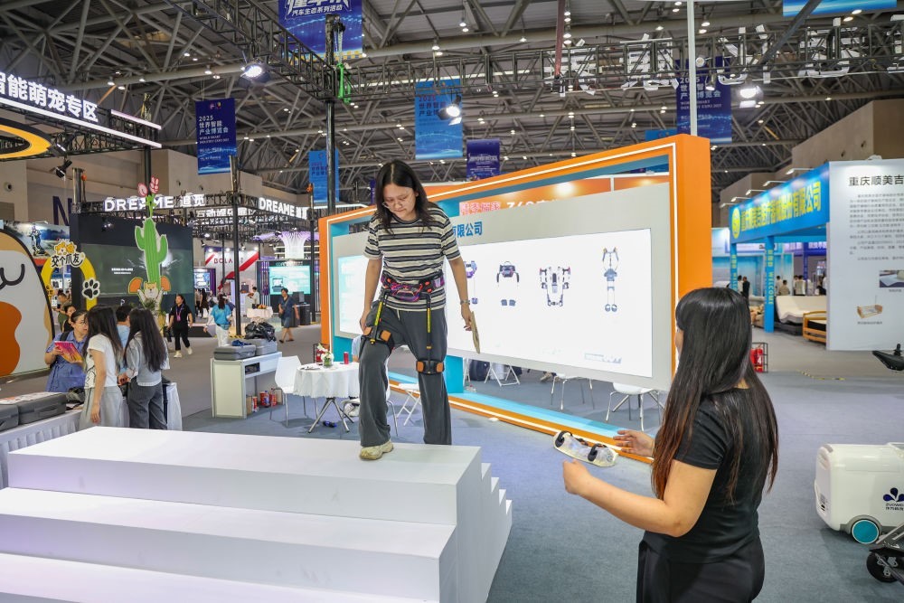 2025年9月5日,在重慶舉行的2025世界智能產(chǎn)業(yè)博覽會(huì)上,觀眾體驗(yàn)外骨骼機(jī)器人。新華社記者黃偉攝