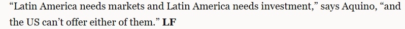文章指出,并非所有人都對(duì)拉美與中國(guó)之間的合作感到滿意。華盛頓尤其擔(dān)心。不過(guò),許多人認(rèn)為華盛頓影響拉丁美洲的能力有限。文章援引利馬國(guó)立圣馬科斯大學(xué)的亞洲經(jīng)濟(jì)專家卡洛斯·阿基諾的話指出,“拉丁美洲需要市場(chǎng)和投資,但美國(guó)無(wú)法提供其中任何一項(xiàng)”。