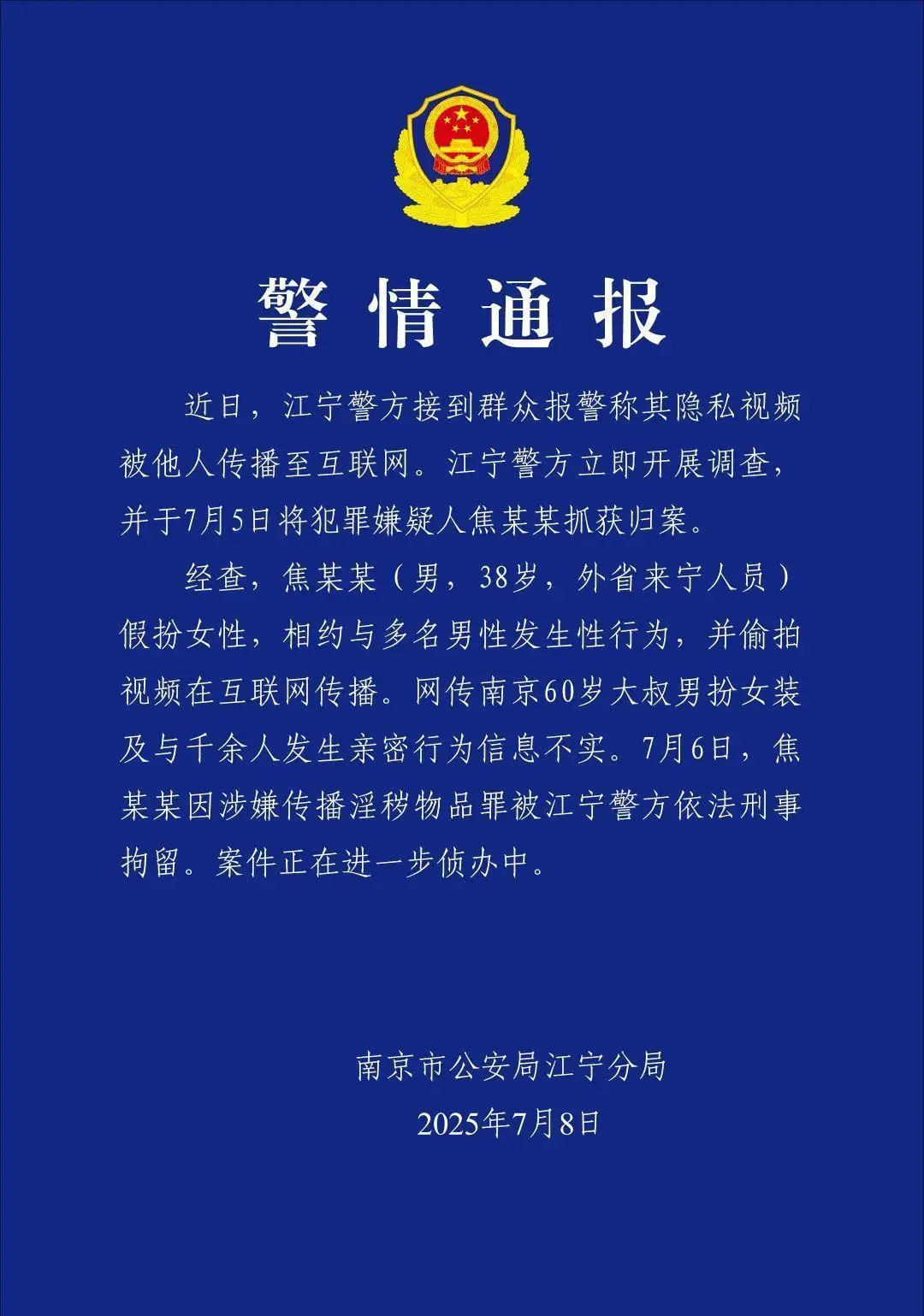 7月8日,南京江寧警方發(fā)布通報(bào)稱(chēng),焦某某(男,38歲,外省來(lái)寧人員)假扮女性,相約與多名男性發(fā)生性行為,并偷拍視頻在互聯(lián)網(wǎng)傳播。網(wǎng)傳南京60歲大叔男扮女裝及與千余人發(fā)生親密行為信息不實(shí)。目前,焦某某因涉嫌傳播淫穢物品罪被江寧警方依法刑事拘留。案件正在進(jìn)一步偵辦中。