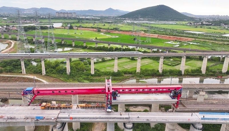 中鐵四局施工機械在巢馬城際鐵路最后一榀箱梁架設現(xiàn)場作業(yè)(7月8日攝,無人機照片)。