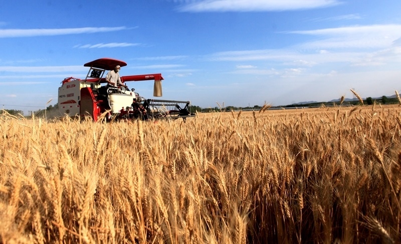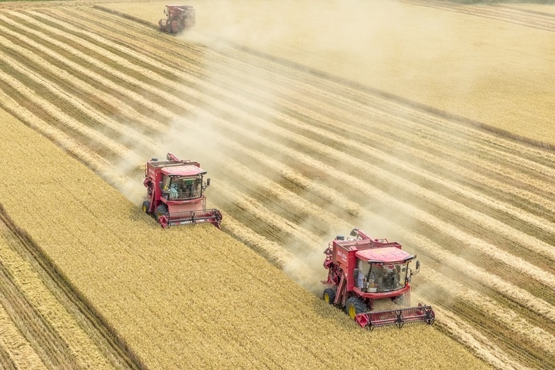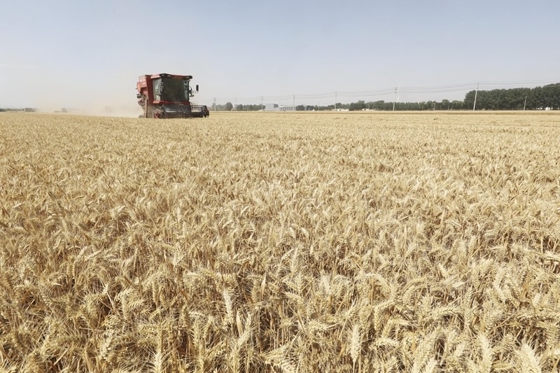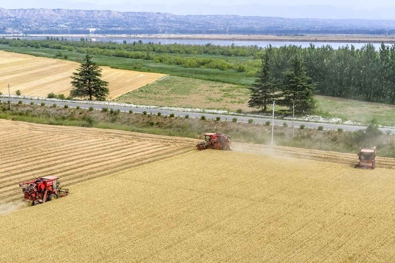 6月5日,河南省焦作市溫縣武德鎮(zhèn)農(nóng)民駕駛收割機收獲小麥。