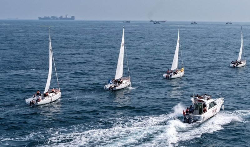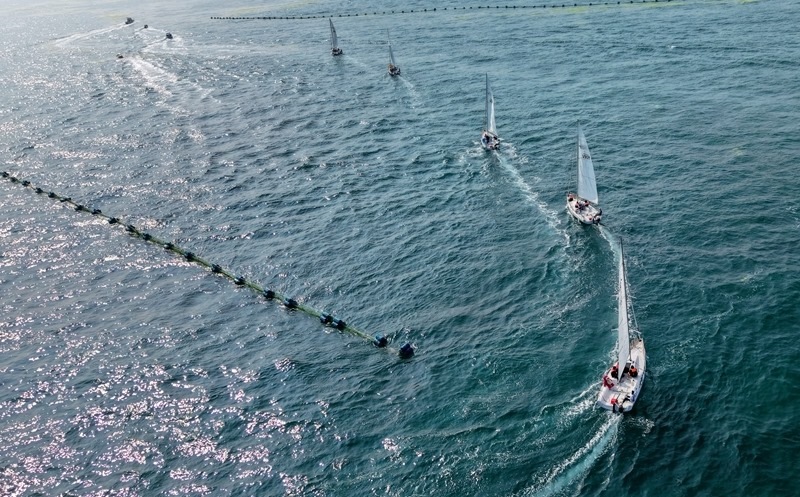 青島小麥島附近海域,市民和游客乘坐帆船參加海上巡游活動(dòng)(7月10日攝,無人機(jī)照片)。