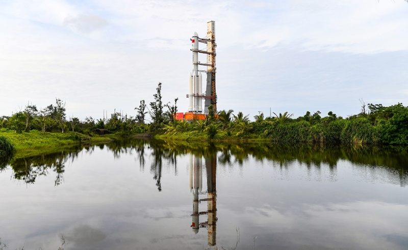 7月12日,天舟九號貨運飛船與長征七號遙十運載火箭組合體垂直轉(zhuǎn)運至發(fā)射區(qū)。