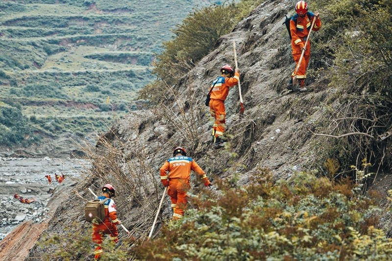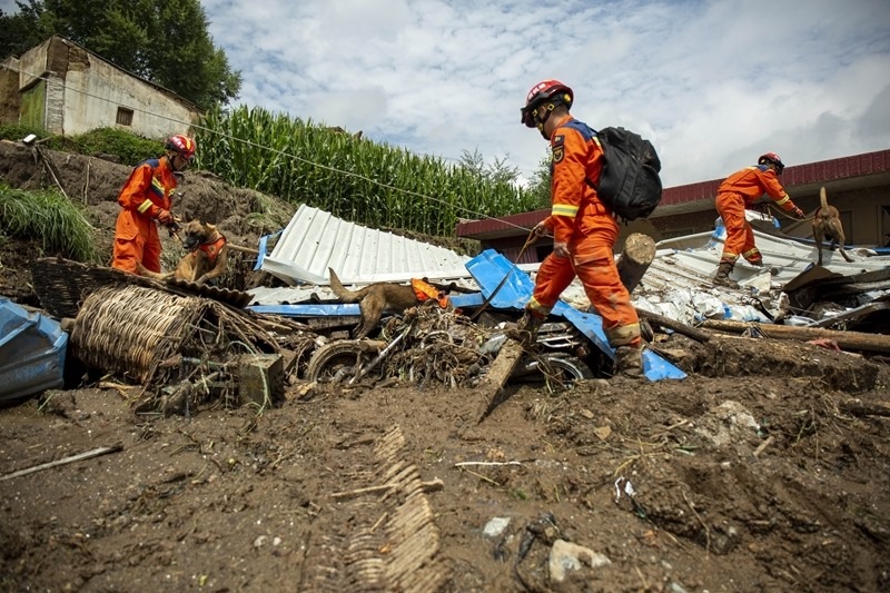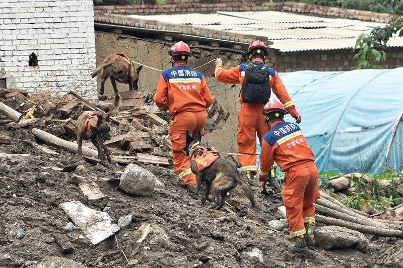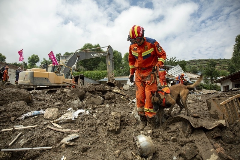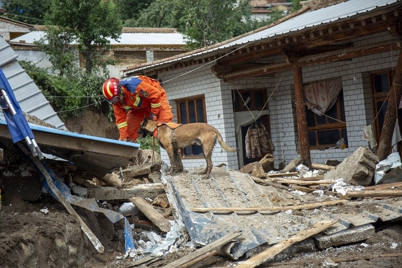 8月9日,國家西北區(qū)域應(yīng)急救援中心指戰(zhàn)員在馬坡鄉(xiāng)舊莊溝村攜帶搜救犬配合大型機械搜救失聯(lián)人員。
