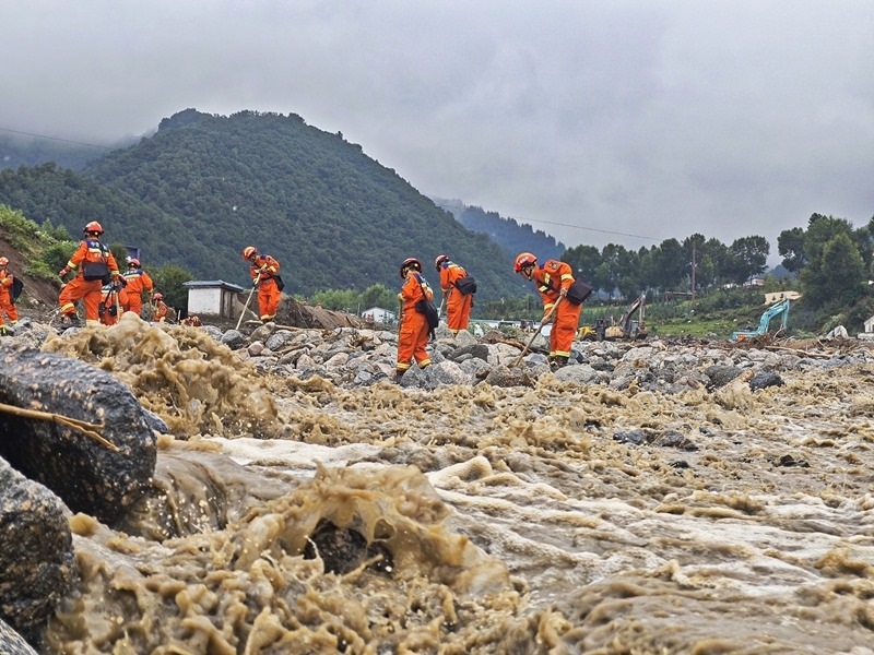 8月9日,甘肅省森林消防總隊消防員在榆中縣馬坡鄉(xiāng)舊莊溝村沿河道搜尋被困人員。