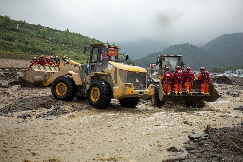 8月9日,國家西北區(qū)域應(yīng)急救援中心指戰(zhàn)員在馬坡鄉(xiāng)舊莊溝村依托大型機械渡河開展搜救工作。