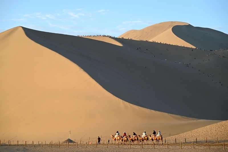 8月9日,游客在甘肅省敦煌市鳴沙山月牙泉景區(qū)游覽。