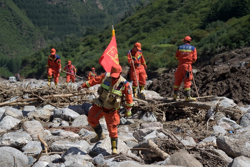 8月11日,在榆中縣馬坡鄉(xiāng)陽屲山村,蘭州市消防救援支隊救援人員開展清理搜尋工作。
