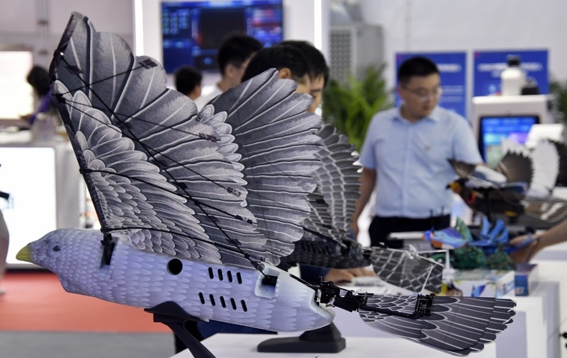 2025世界機器人大會上展示的仿生機器鳥(8月8日攝)。