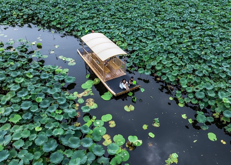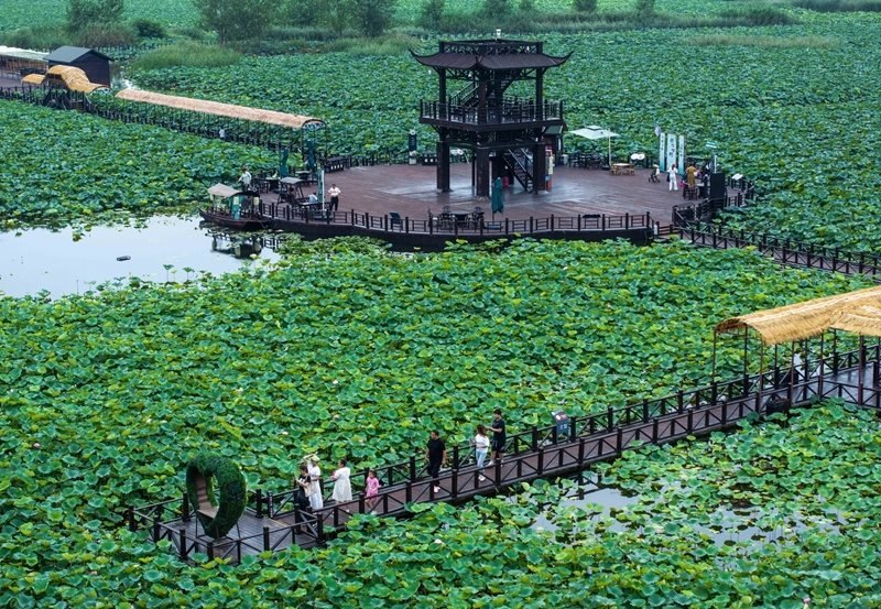 8月13日,游客在江蘇省興化市萬(wàn)畝荷塘景區(qū)賞荷游玩(無(wú)人機(jī)照片)。