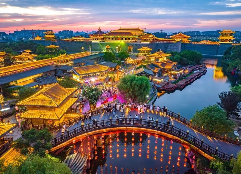 8月11日,湖北省襄陽(yáng)市唐城景區(qū)夜景璀璨,吸引游客前來(lái)游玩(無(wú)人機(jī)照片)。