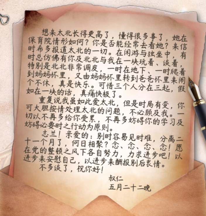 在信的最后,左權(quán)不得不忍痛交代妻子:“我雖如此愛太北,但是時局有變,你可大膽按情處理太北的問題,不必顧及我。”并勉勵妻子以進(jìn)步來安慰自己,以進(jìn)步來酬報別后衷情。