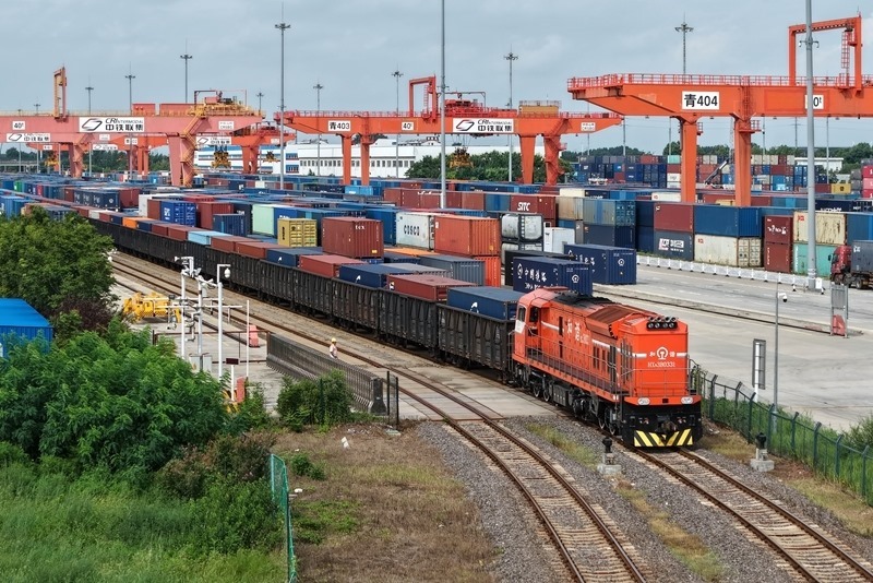 8月27日,貨運(yùn)列車駛?cè)胛挥谏虾鲜痉秴^(qū)內(nèi)的中國-上海合作組織地方經(jīng)貿(mào)合作示范區(qū)多式聯(lián)運(yùn)中心(無人機(jī)照片)。