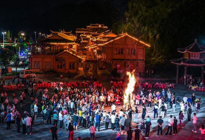 10月5日晚,在貴州省晴隆縣阿妹戚托小鎮(zhèn),游客與當(dāng)?shù)厝罕妵艋鸸参琛?br/>