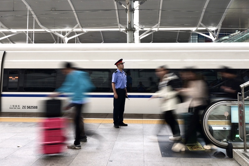 10月6日,在鐵路徐州東站,工作人員引導旅客乘坐列車。