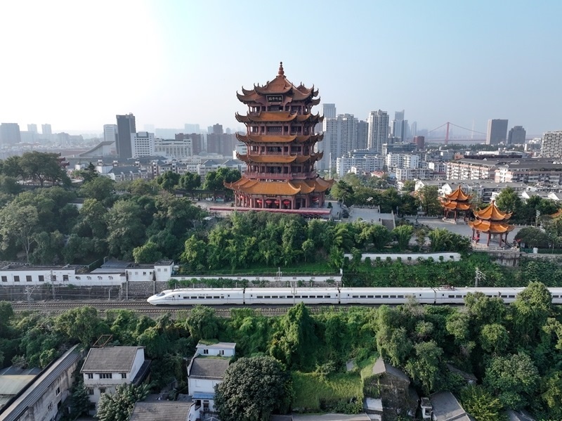 10月10日,動(dòng)車組列車經(jīng)過(guò)湖北省武漢市黃鶴樓(無(wú)人機(jī)照片)。