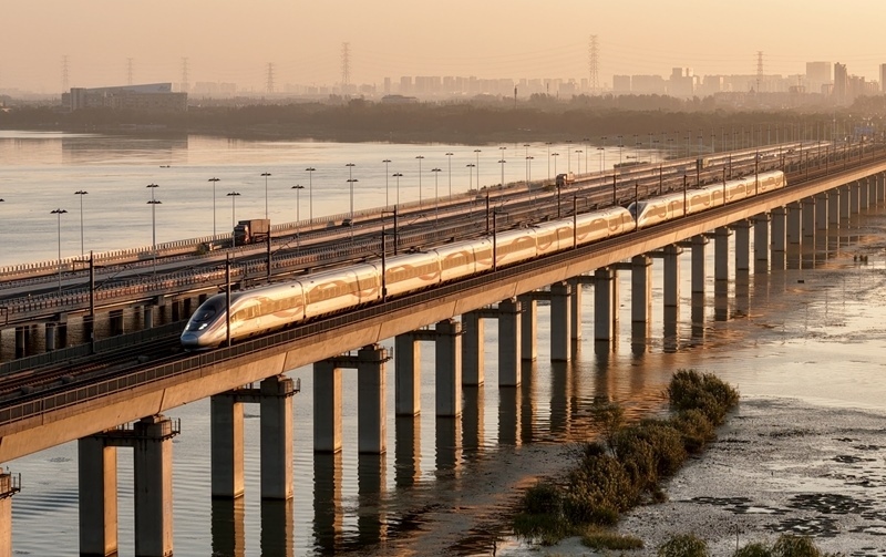 10月10日,在江蘇省昆山市,動(dòng)車組列車通過(guò)京滬高鐵丹昆特大橋陽(yáng)澄湖段(無(wú)人機(jī)照片)。