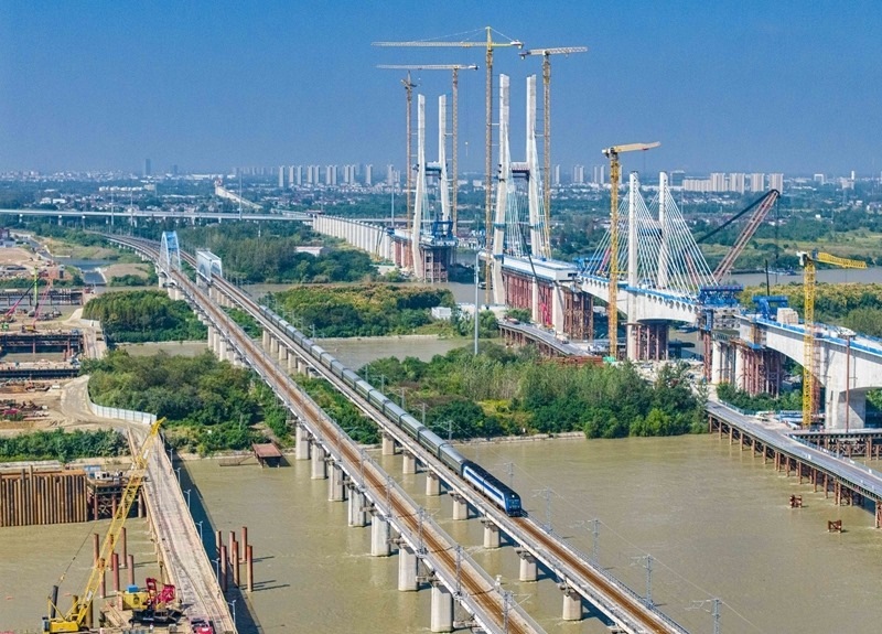 10月10日在江蘇南京拍攝的行駛中的動(dòng)車組列車(無(wú)人機(jī)照片)。