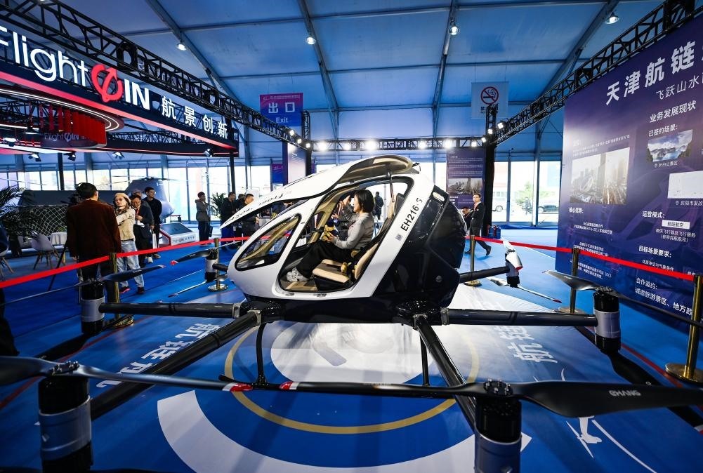 10月16日,觀眾在天津直博會(huì)低空經(jīng)濟(jì)館內(nèi)體驗(yàn)一款eVTOL(電動(dòng)垂直起降飛行器)。新華社記者 趙子碩 攝