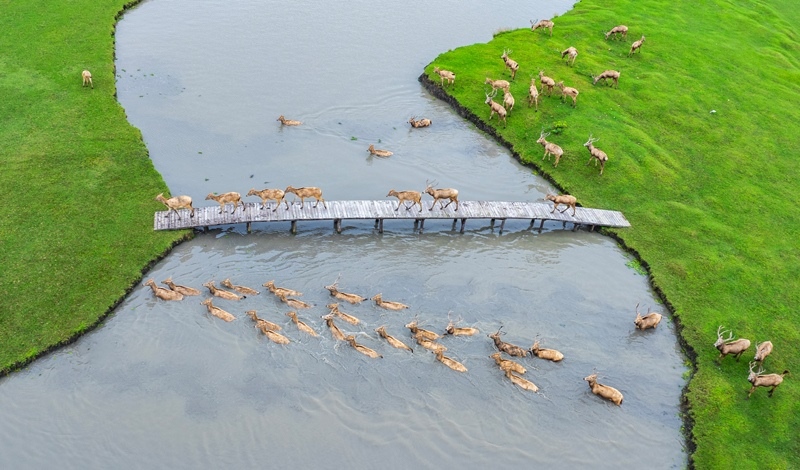 10月17日,在江蘇省泰州市姜堰區(qū)溱湖國(guó)家濕地公園,一群麋鹿通過獨(dú)木橋(無人機(jī)照片)。