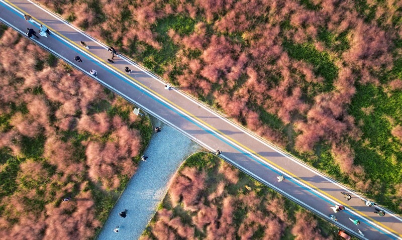 10月18日,游客在山東省東營(yíng)市東營(yíng)區(qū)耿井濕地粉黛亂子草“花?!迸恼沾蚩ǎo人機(jī)照片)。