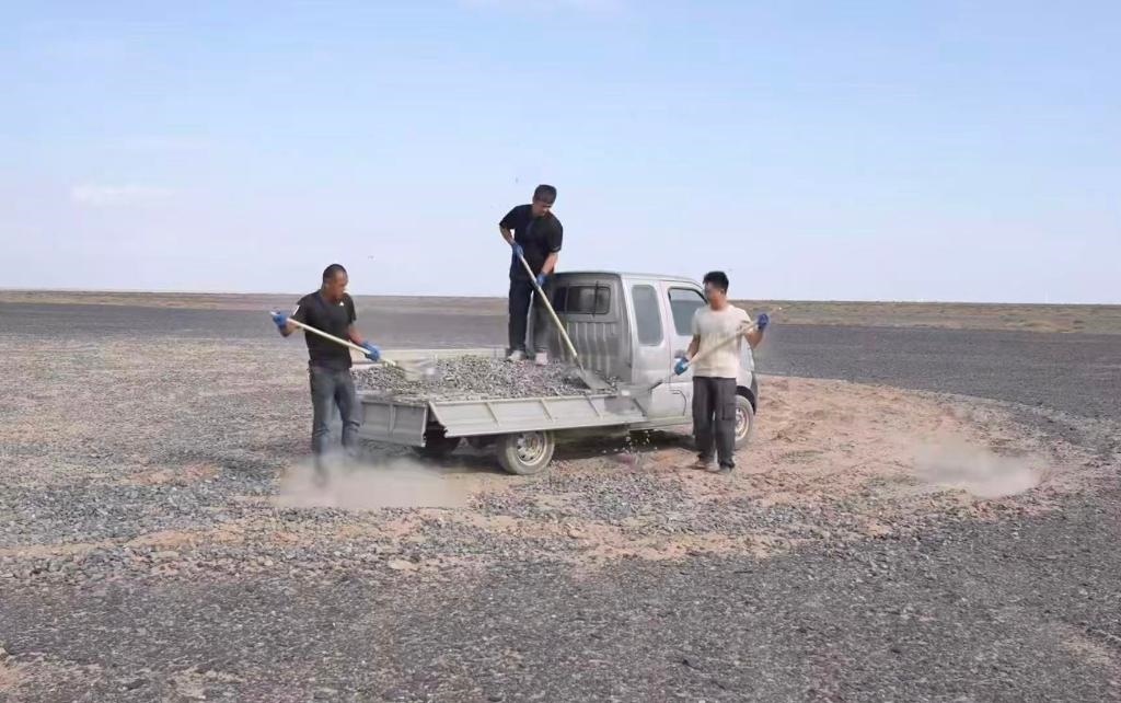 “看到車輪碾過標(biāo)語那一刻,就像碾在歷史的脊梁上?!本W(wǎng)絡(luò)博主陸遙得知標(biāo)語被破壞后,主動驅(qū)車兩千多公里,經(jīng)歷六天抵達(dá)哈密。他和朋友們拉運(yùn)20噸砂石,才終于修復(fù)這些“疤痕”。