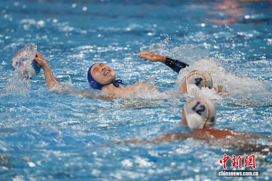 10月27日晚,在廣東廣州舉行的第十五屆全國運(yùn)動(dòng)會(huì)水球男子組比賽金牌賽中,廣東隊(duì)(藍(lán)帽)以16比9戰(zhàn)勝上海隊(duì)(白帽),獲得金牌。圖為上海隊(duì)運(yùn)動(dòng)員王貝易(中)和廣東隊(duì)運(yùn)動(dòng)員譚恒業(yè)(右)在比賽中拼搶。