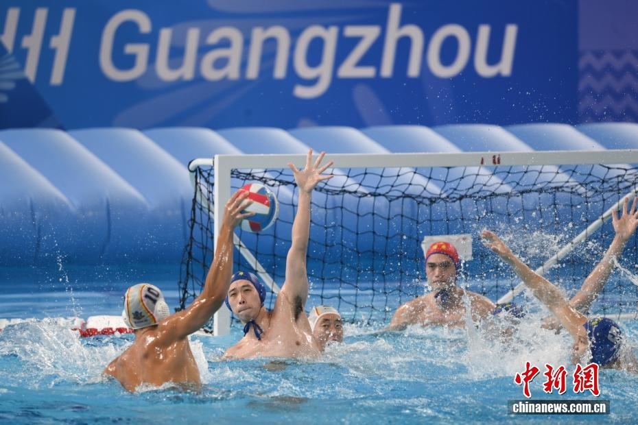 10月27日晚,在廣東廣州舉行的第十五屆全國運(yùn)動(dòng)會(huì)水球男子組比賽金牌賽中,廣東隊(duì)以16比9戰(zhàn)勝上海隊(duì),獲得金牌。圖為上海隊(duì)11號(hào)運(yùn)動(dòng)員蔡宇浩(白帽)在比賽中進(jìn)攻。