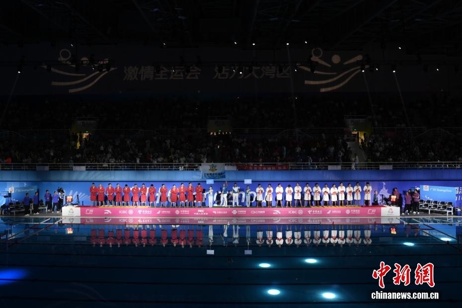 10月27日晚,在廣東廣州舉行的第十五屆全國運(yùn)動(dòng)會(huì)水球男子組比賽金牌賽中,廣東隊(duì)(紅衣)以16比9戰(zhàn)勝上海隊(duì)(白衣),獲得金牌。圖為雙方運(yùn)動(dòng)員出場(chǎng)。
