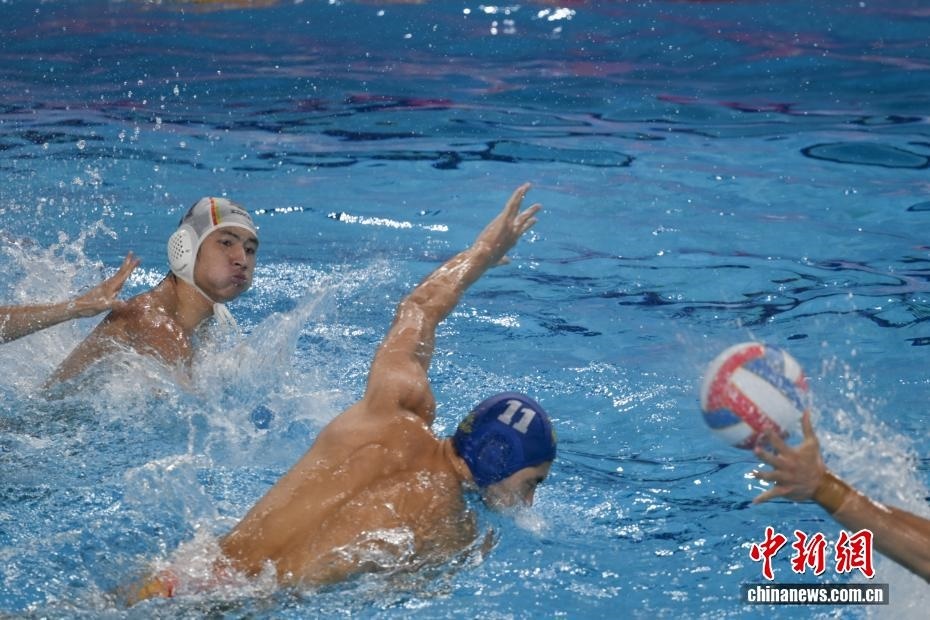 10月27日晚,在廣東廣州舉行的第十五屆全國運(yùn)動(dòng)會(huì)水球男子組比賽金牌賽中,廣東隊(duì)以16比9戰(zhàn)勝上海隊(duì),獲得金牌。圖為廣東隊(duì)運(yùn)動(dòng)員解澤楷(藍(lán)帽)在比賽中進(jìn)攻。