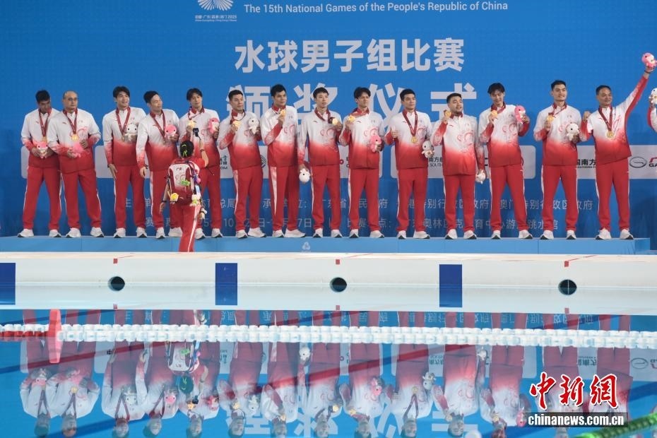 10月27日晚,在廣東廣州舉行的第十五屆全國運(yùn)動(dòng)會(huì)水球男子組比賽金牌賽中,廣東隊(duì)以16比9戰(zhàn)勝上海隊(duì),獲得金牌。圖為廣東隊(duì)在頒獎(jiǎng)儀式向觀眾致謝。