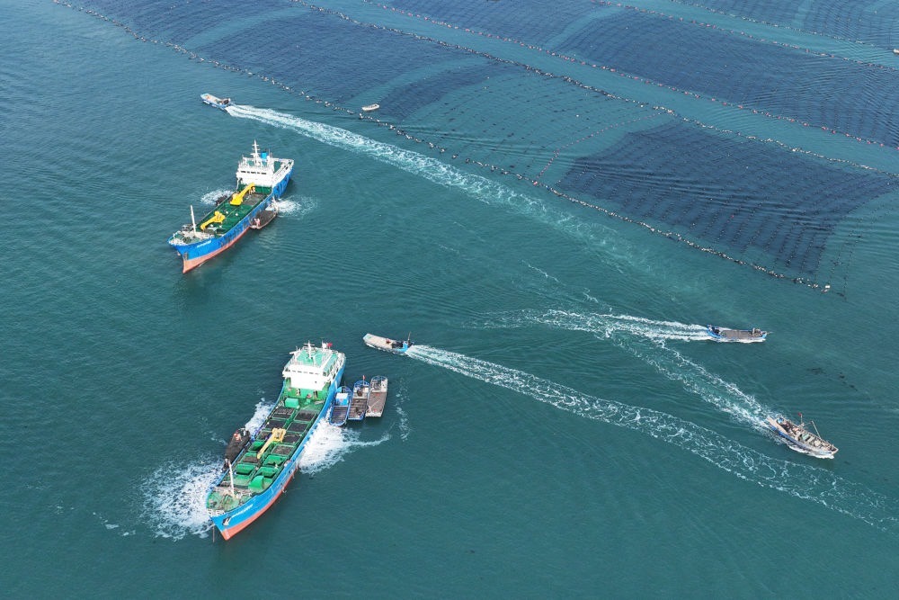 ↑ 11月11日,在山東省榮成市愛倫灣海洋牧場,運鮮船在裝運鮑魚南下福建越冬(無人機照片)。新華社發(fā)(王福東 攝)