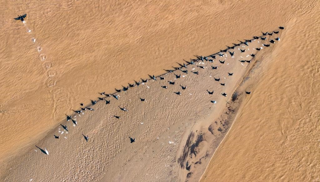 11月4日,在位于寧夏靈武市境內的黃河,候鳥在河灘上駐足棲息(無人機照片)。新華社記者 楊植森 攝