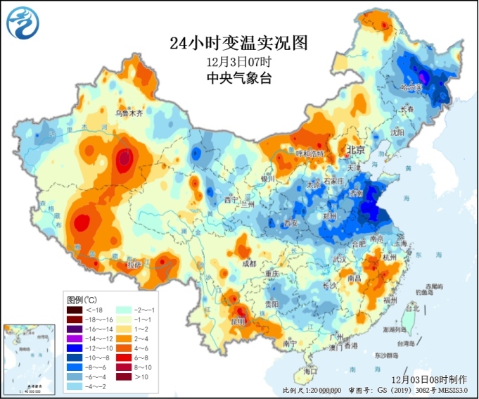 中國網(wǎng)12月3日訊 據(jù)中央氣象臺消息,隨著寒潮主體進一步東移南下,過去一天我國中東部地區(qū)氣溫持續(xù)下跌。最新氣象監(jiān)測顯示,3日早晨,山東、河南、江蘇、安徽一帶氣溫下降幅度達到4~8℃,局地降幅超過10℃,最低氣溫0℃線位于蘇皖北部、河南南部至陜西南部等地。