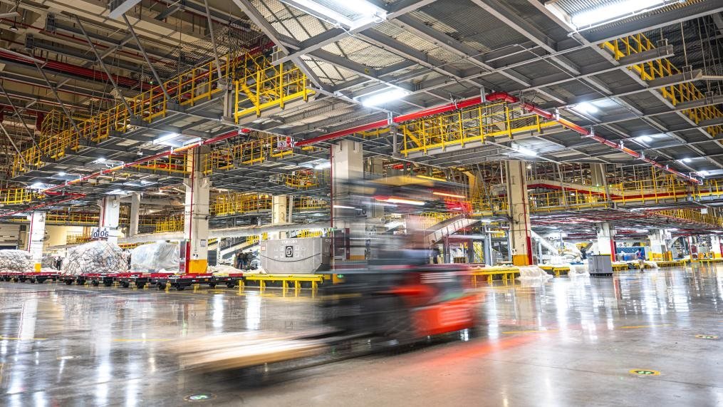 跟隨轉(zhuǎn)運(yùn)車(chē),記者來(lái)到了建筑面積達(dá)75萬(wàn)平方米的機(jī)場(chǎng)“工”字形轉(zhuǎn)運(yùn)中心。這里,“快點(diǎn)、快點(diǎn)”的催促聲與機(jī)器有節(jié)律的運(yùn)行聲形成交響,在2萬(wàn)多臺(tái)自動(dòng)分揀設(shè)備和50多公里長(zhǎng)傳送帶的支持下,工人們熟練地將數(shù)量規(guī)格不一的包裹抱起、分類(lèi)、組合、打包,再拼裝出多個(gè)符合航空貨運(yùn)規(guī)格和形狀要求的大包裹。