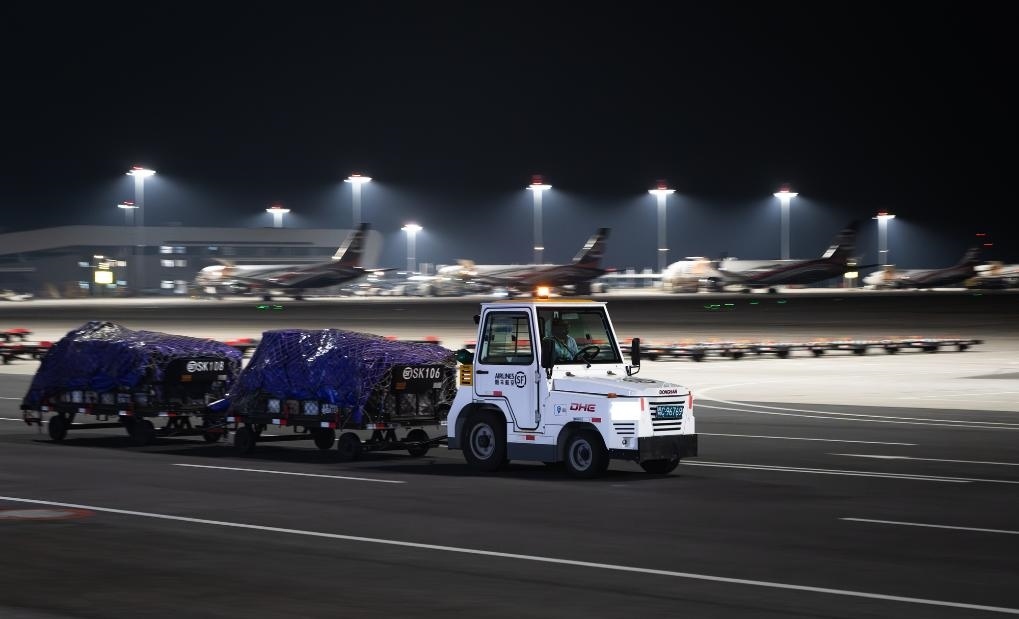 子夜時(shí)分,記者驅(qū)車(chē)來(lái)到這座機(jī)場(chǎng)時(shí),撲面而來(lái)的是一派“不夜空港”的繁忙景象:雪亮的停機(jī)坪上,貨機(jī)剛一停穩(wěn),工作人員便操控牽引車(chē)、加油車(chē)、轉(zhuǎn)運(yùn)車(chē)簇?fù)矶?,卸貨、加油、檢查,井井有條,一刻也不耽誤。