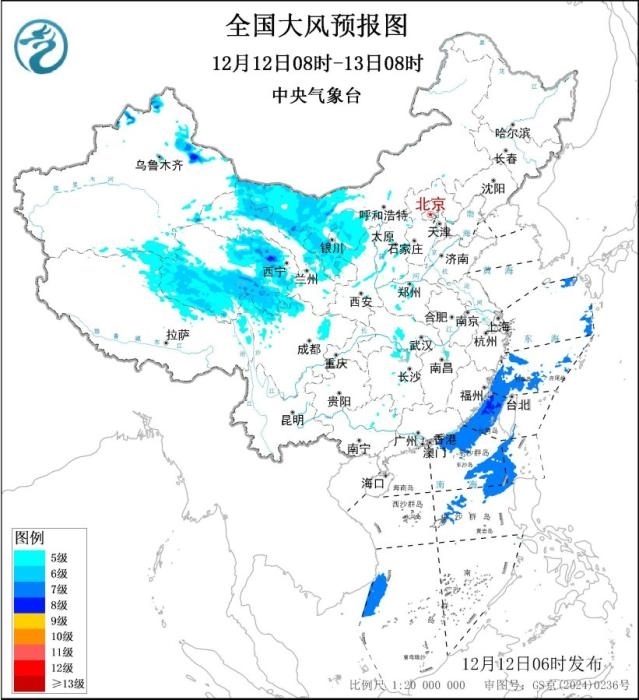 此外,12月12日08時至13日08時,新疆北部、青海、西藏北部、內(nèi)蒙古西部、四川北部、甘肅東部、寧夏、陜西西北部等地部分地區(qū)有5~7級、陣風(fēng)8~9級的大風(fēng),其中,新疆山口地區(qū)陣風(fēng)可達(dá)10~11級;東海南部部分海域、臺灣海峽、巴士海峽、南海東北部和中東部部分海域?qū)⒂?級、陣風(fēng)8~9級的大風(fēng)。中央氣象臺12月12日06時繼續(xù)發(fā)布大風(fēng)藍(lán)色預(yù)警。