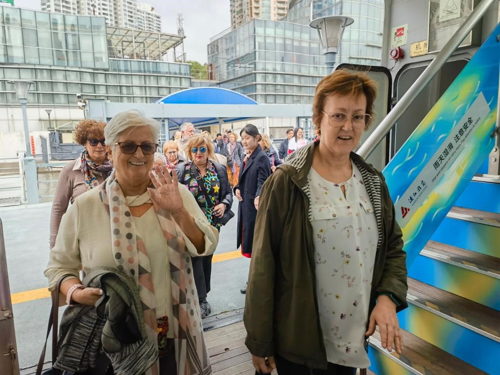 11月5日,來自西班牙等國(guó)的游客登上黃浦江游船。新華社記者 陳愛平 攝