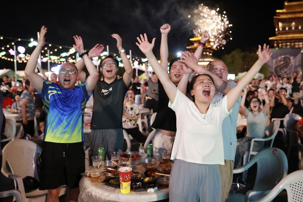 7月20日,球迷在淮安市漕運門廣場觀看“蘇超”淮安隊對陣無錫隊的比賽。新華社發(fā)(徐昌政 攝)