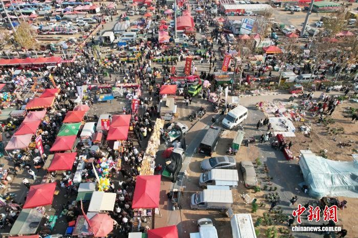 12月8日,山東省臨沂市臨沭縣,民眾暢游曹洼大集。近期,曹洼大集憑借超高性價(jià)比的特色美食、濃郁的民俗氛圍、線上線下聯(lián)動(dòng)的鮮活場景火爆全網(wǎng)。(無人機(jī)照片) 中新社記者 王峰 攝