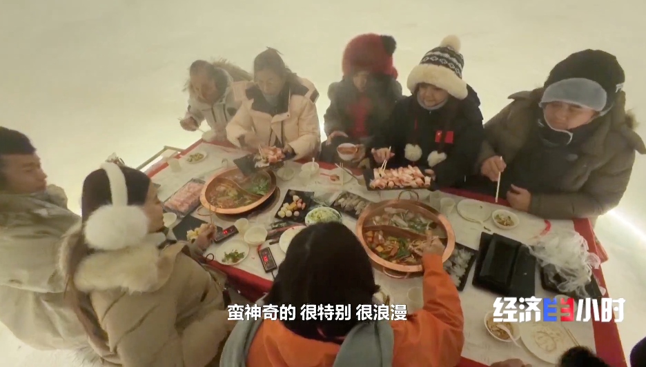 游客們在冰天雪地里漂上一程,一上岸,就奔向特色雪屋。在這里享用熱氣騰騰的火鍋,體驗“冰火兩重天”的樂趣。