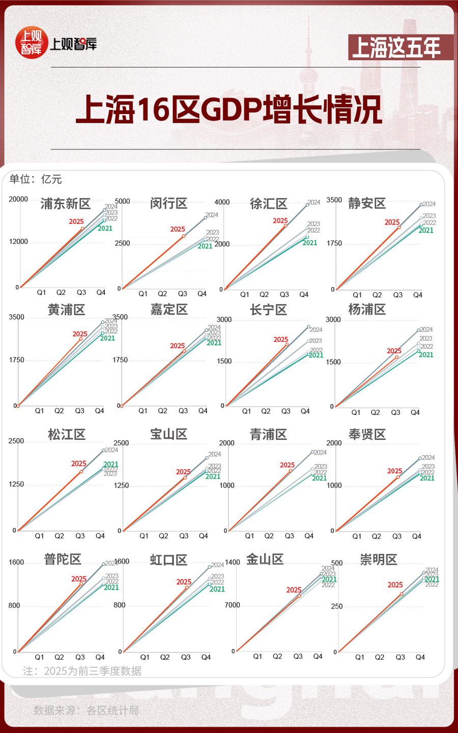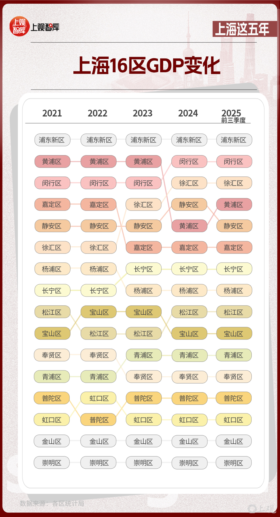 區(qū)域?qū)用妫虾?6區(qū)GDP的變化,體現(xiàn)出從中心向多極擴(kuò)散的趨勢(shì)。2021年,浦東新區(qū)GDP占全市近36%,而到了2025年,這一比重下降至約33%。其他區(qū)在這五年間,充分發(fā)揮自身優(yōu)勢(shì),齊頭并進(jìn),為上海發(fā)展創(chuàng)造了更多增長(zhǎng)極。