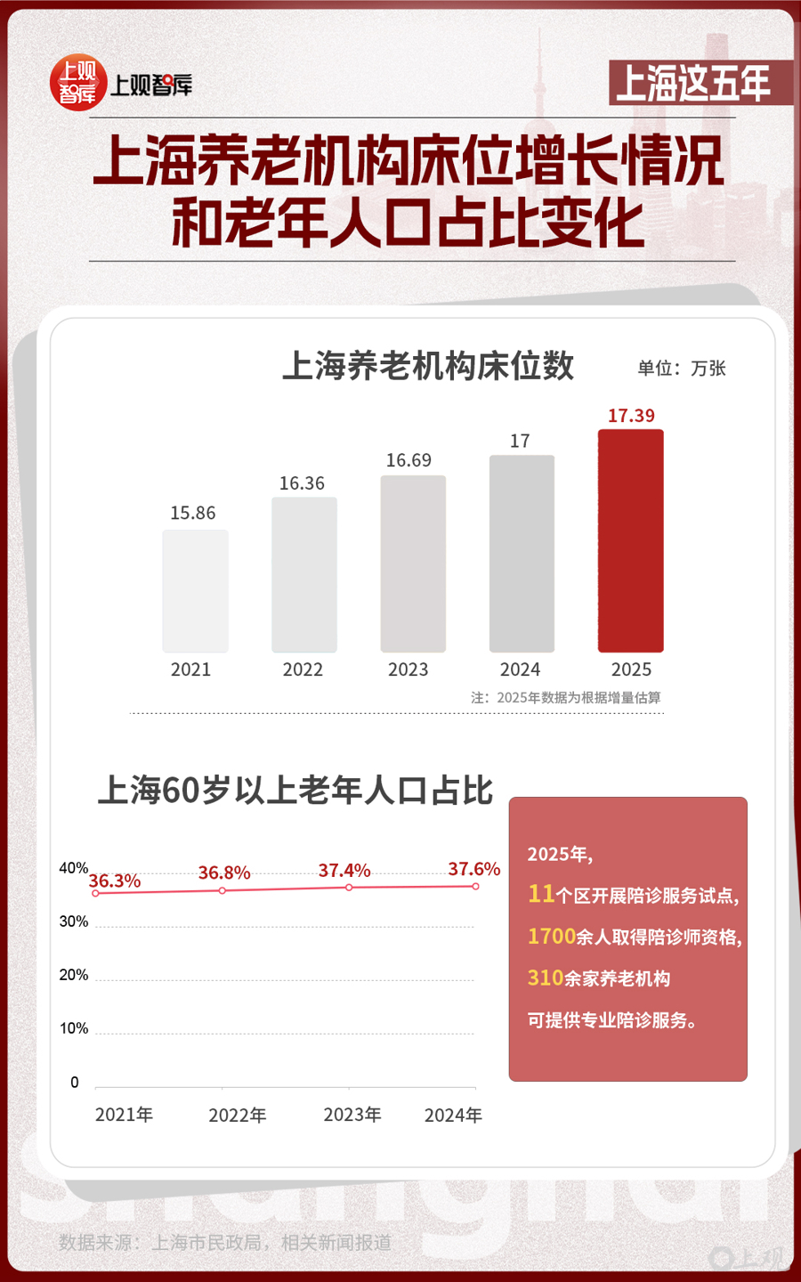 截至2025年3月底,上海市60歲及以上戶籍老年人口達(dá)到518.7萬(wàn)人,占戶籍總?cè)丝诘?6.2%。上海相關(guān)健康指標(biāo)持續(xù)優(yōu)化,人均期望壽命有望超過(guò)84歲,保持發(fā)達(dá)國(guó)家水平。