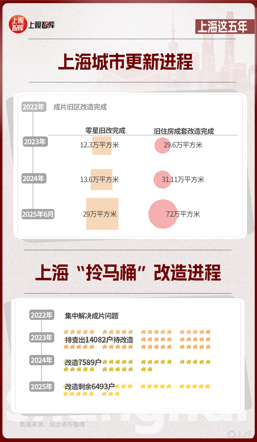 2022年,上海市成片舊區(qū)改造完成;此后,上海加力推進(jìn)“兩舊一村”改造。2023年到2025年6月底,零星舊改完成約29萬(wàn)平方米,舊住房成套改造完成約72萬(wàn)平方米,城中村改造認(rèn)定44個(gè)項(xiàng)目,完成老舊小區(qū)改造3910萬(wàn)平方米,提前完成舊改核心任務(wù)。