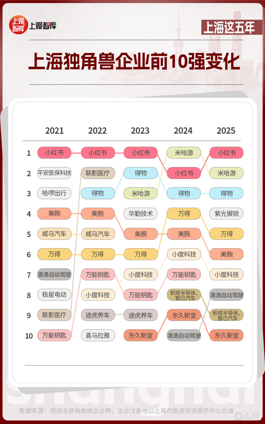 前10位的上海獨(dú)角獸企業(yè),從2021年到2025年,發(fā)生了不小的改變。有的企業(yè)已經(jīng)上市,如聯(lián)影醫(yī)療、華勤技術(shù)等;有的企業(yè)悄然退場(chǎng);有的企業(yè)仍持續(xù)霸榜,如小紅書(shū)、米哈游、得物、美腕、萬(wàn)得。獨(dú)角獸企業(yè)的變動(dòng)與產(chǎn)業(yè)趨勢(shì)息息相關(guān)。當(dāng)新能源汽車產(chǎn)業(yè)進(jìn)入高質(zhì)量發(fā)展的階段時(shí),智己汽車接過(guò)領(lǐng)軍大旗;在AI芯片成為市場(chǎng)熱點(diǎn)時(shí),積塔半導(dǎo)體、紫光展銳已躋身芯片新勢(shì)力代表之列。